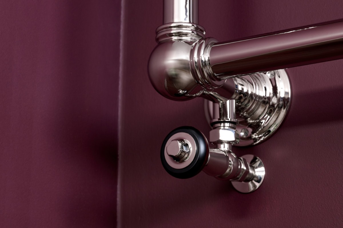 Image: the wall-mounted Baronial 700mm x 1200mm, finished in Polished Nickel with our Windsor Angled TRV.