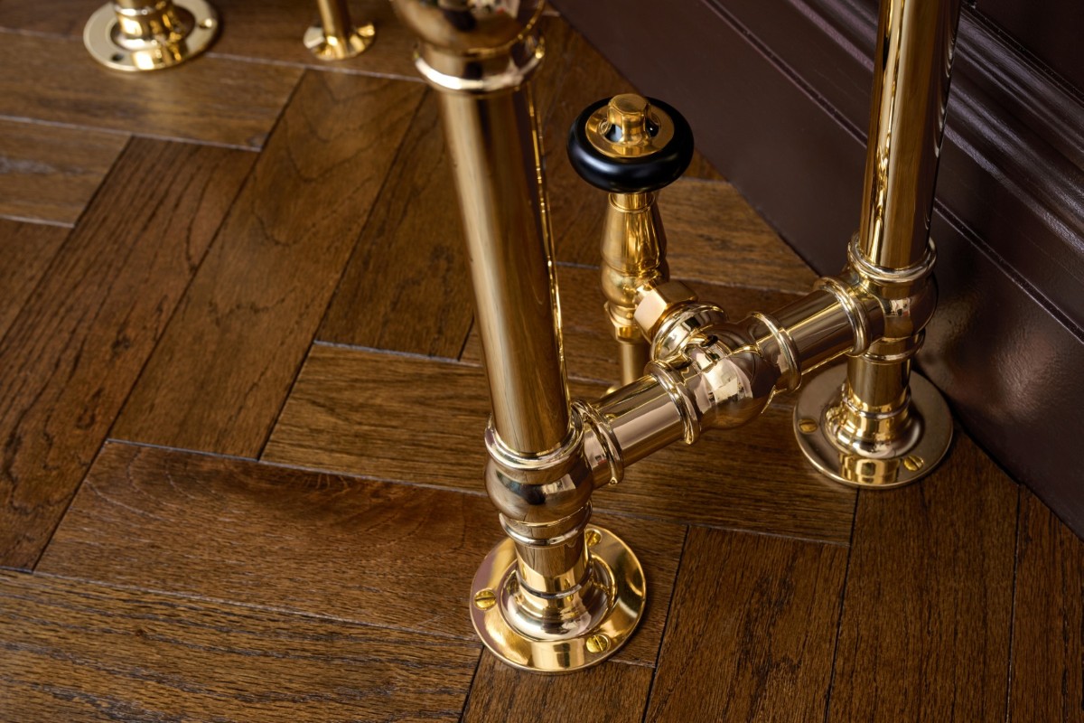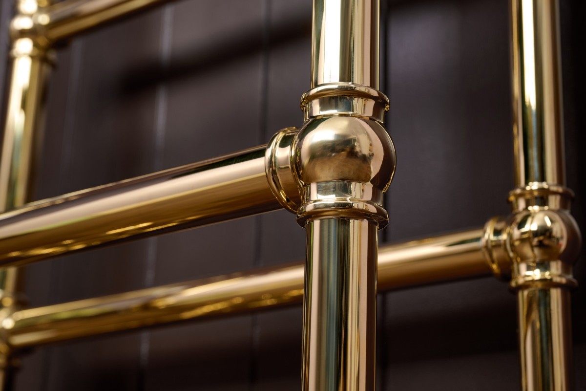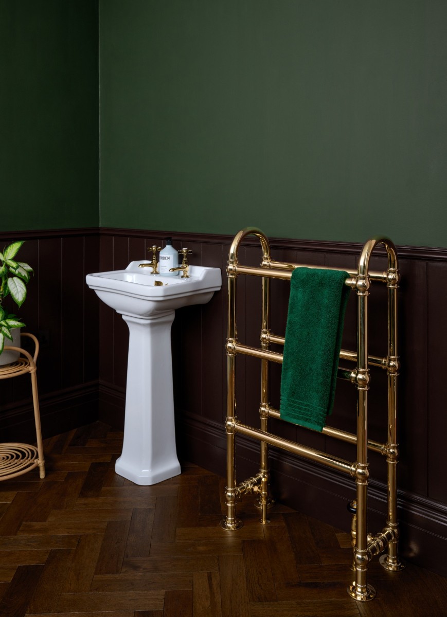 Image: the arched, floor-standing La Fayette towel rail, finished in Polished Brass with our Windsor Angled TRV.